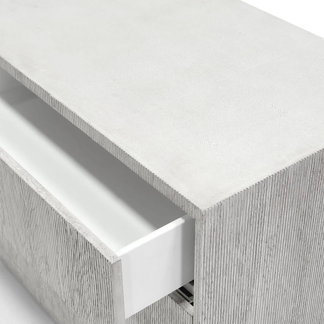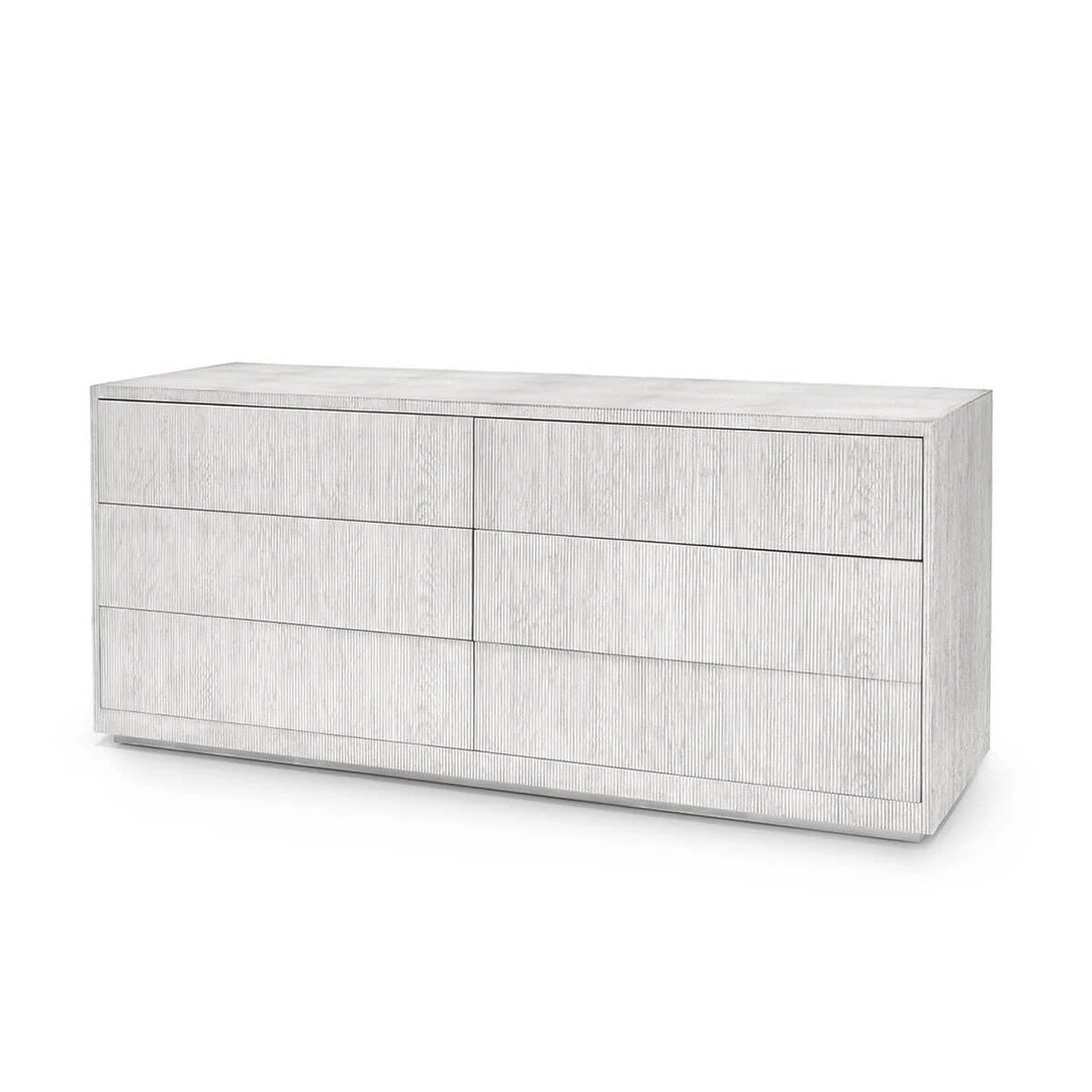 The Goldsboro Dresser features resin fibreglass reeded details on drawer fronts and a faux shagreen detail on the top of the solid hardwood frame. The Goldsboro is complete with a whitewash finish. The six drawers are equipped with a touch latch self-closing mechanism.