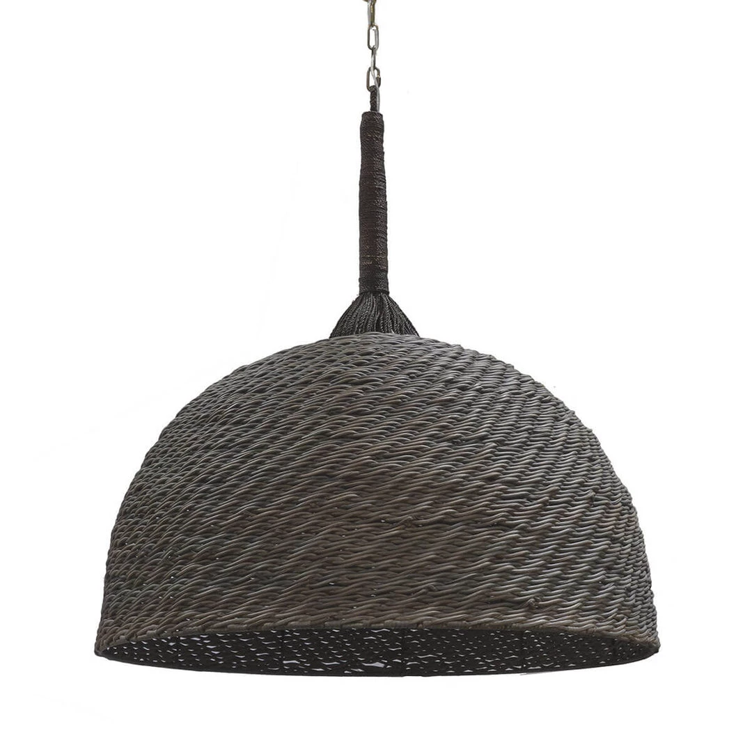 The Kendari Chandelier is hand-woven with a whitewash or grey finish over the wicker. The hanger is made with a hand-twisted lampakanai rope. This ceiling light comes with a nickel-finished chain and canopy hanging kit.