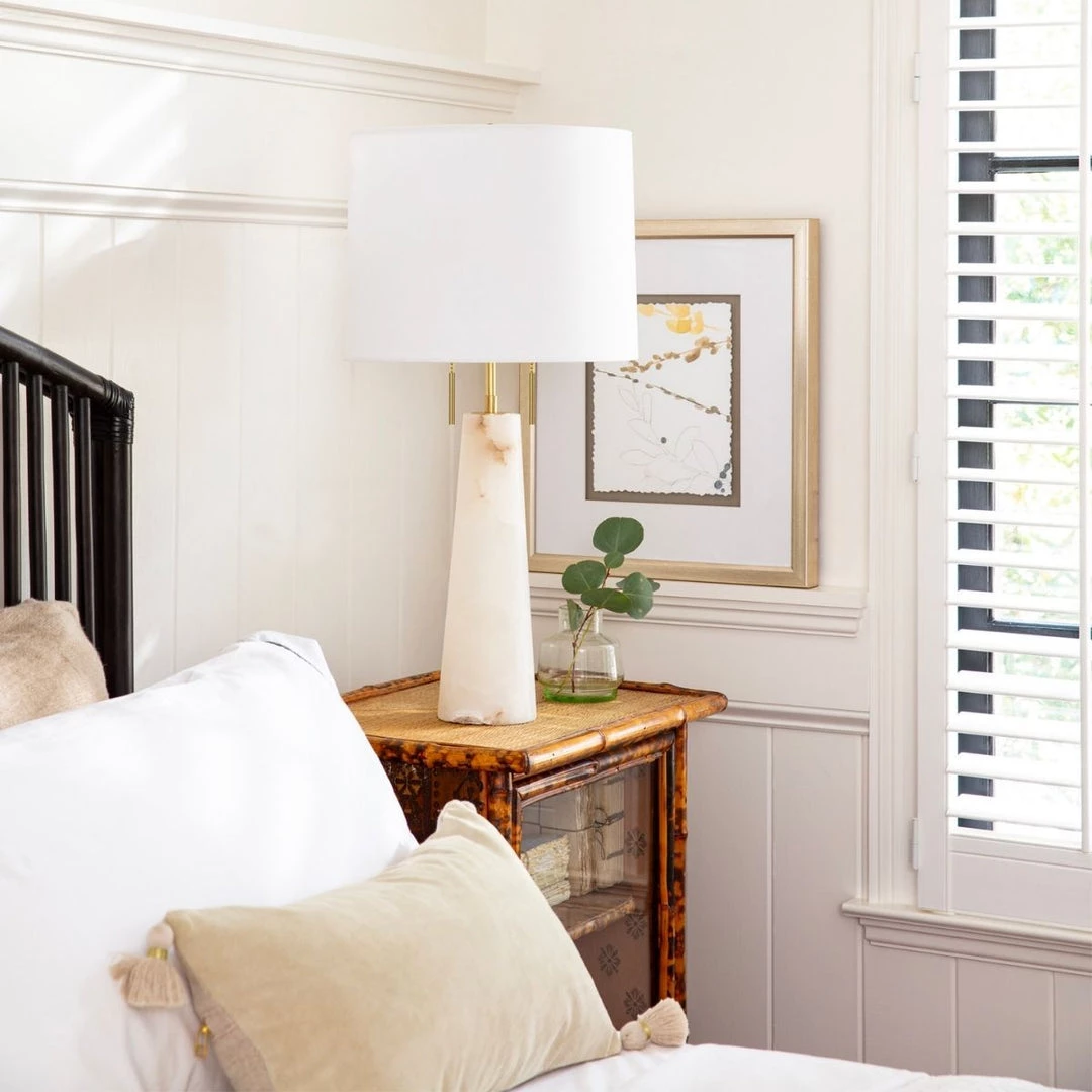 The Bellambi Table lamp is crafted from beautiful alabaster stone in a conical shaped silhouette.