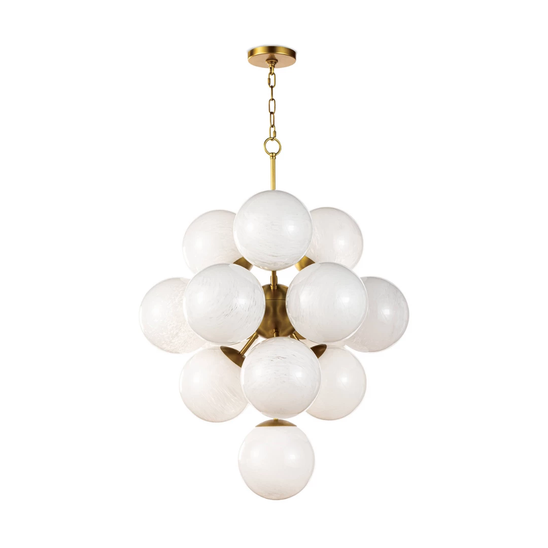 In the Goldwin chandelier, French elegance meets Mid-Century Modern design. A romantic glow will be illuminated by its round glass globes, giving it an ethereal appearance. This statement chandelier, which is 3 feet long, would “wow” in a dining room or foyer with high ceilings.