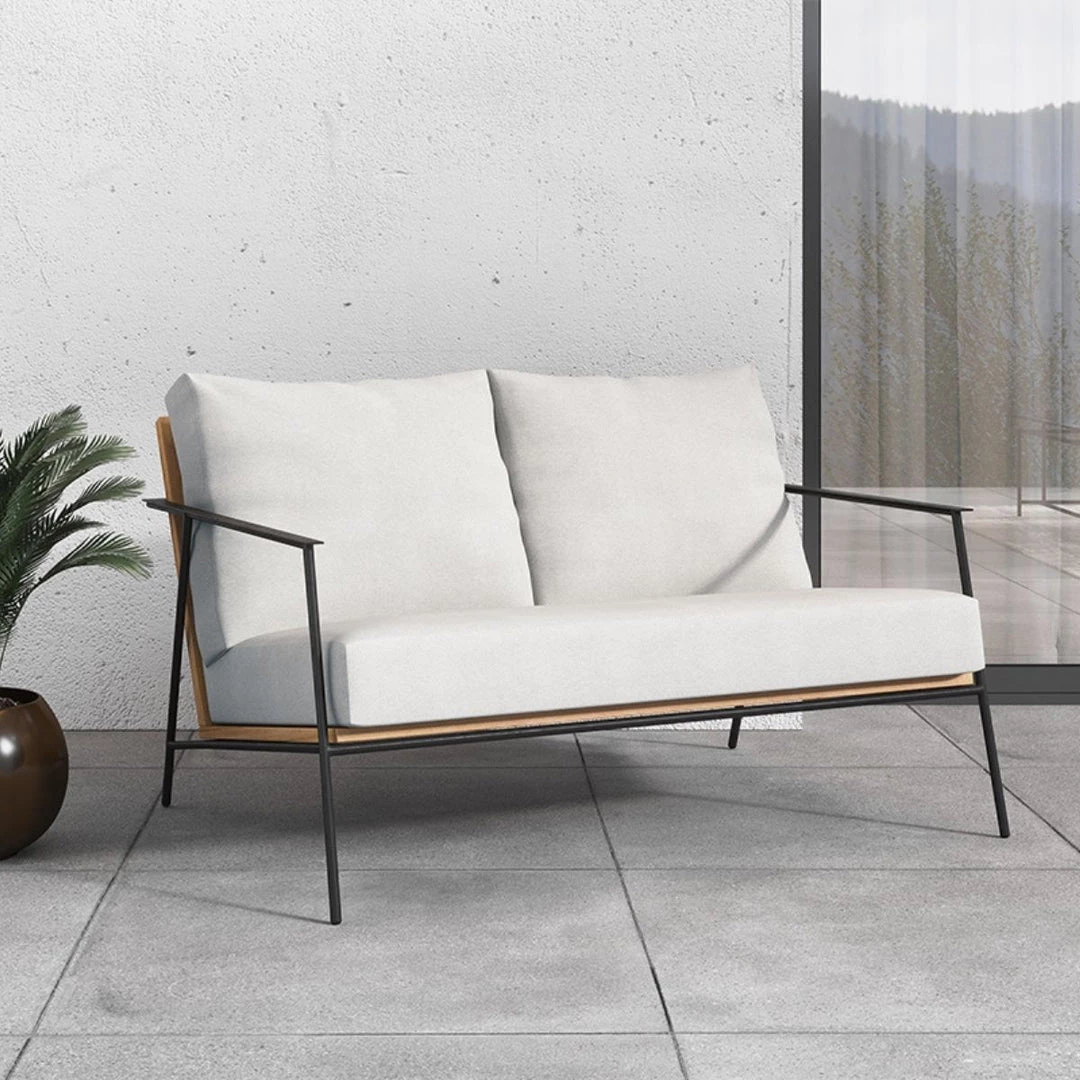 The Bonnechere Sofa brings a contemporary and relaxing element to both indoor and outdoor spaces. Available in two different sizes, the Bonnechere features a durable synthetic fabric in a crisp white finish, contrasted with a teak wood base and bold black frame.