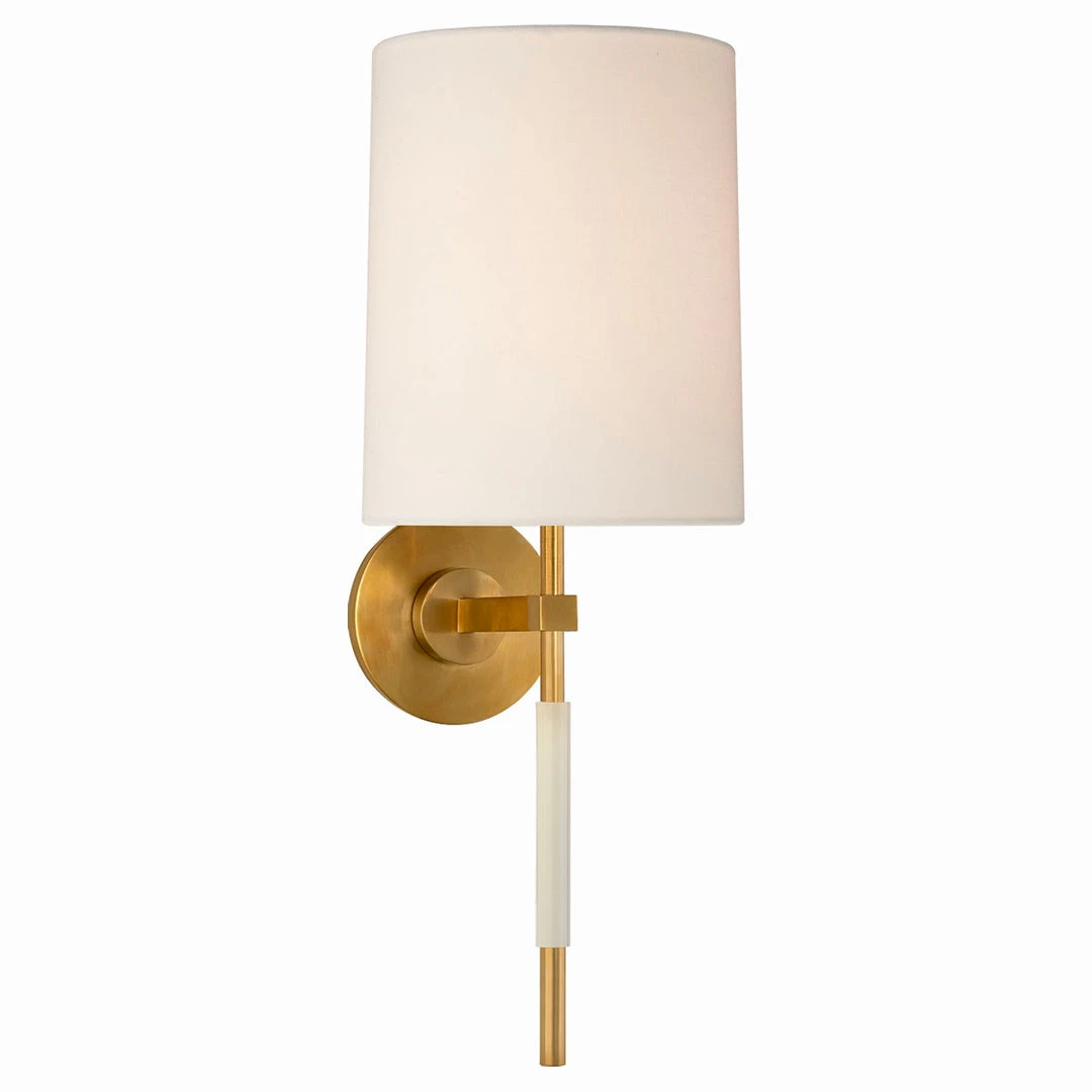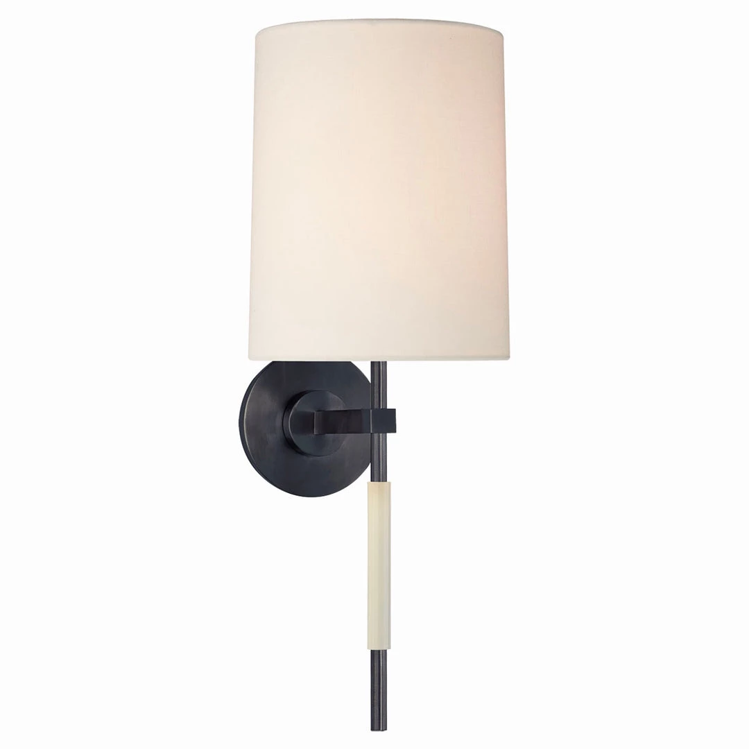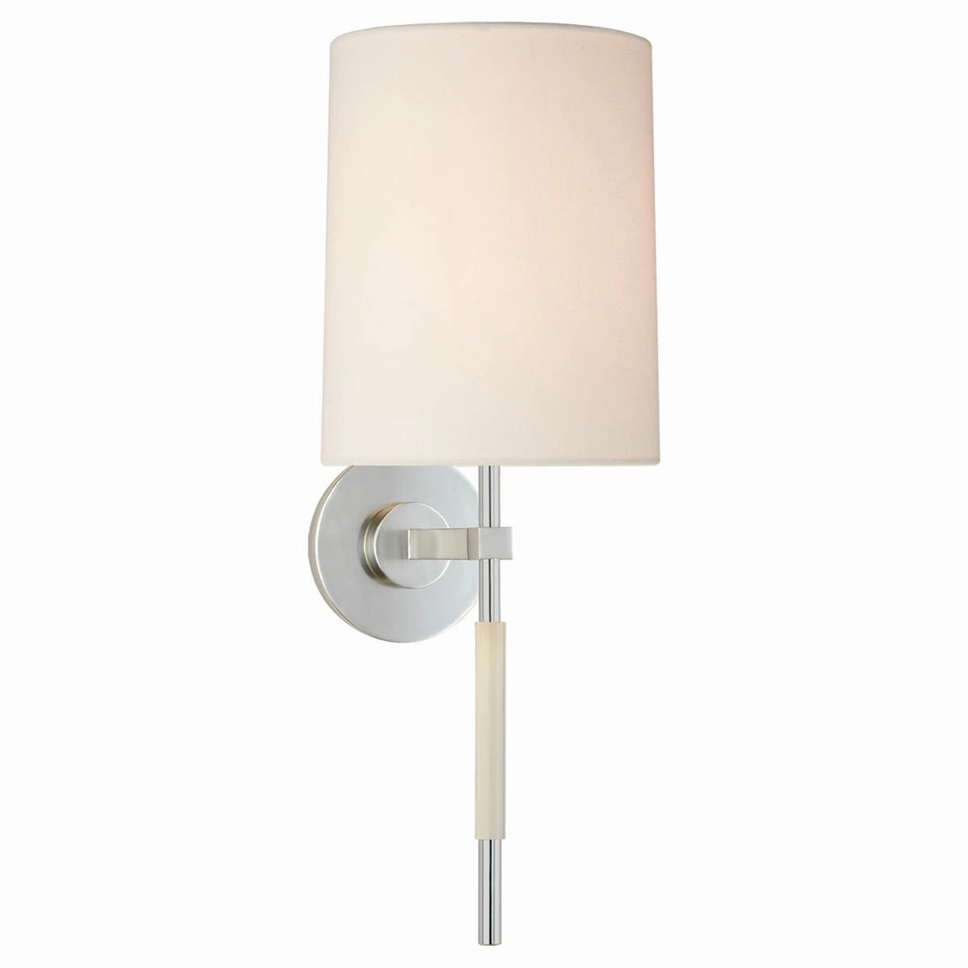 The Cloud Tail Sconce is a modern take on a traditional candle sconce. With its slender linear tail made of white porcelain, and classic linen shade, this sconce features is a delicate addition to your interior space.Â