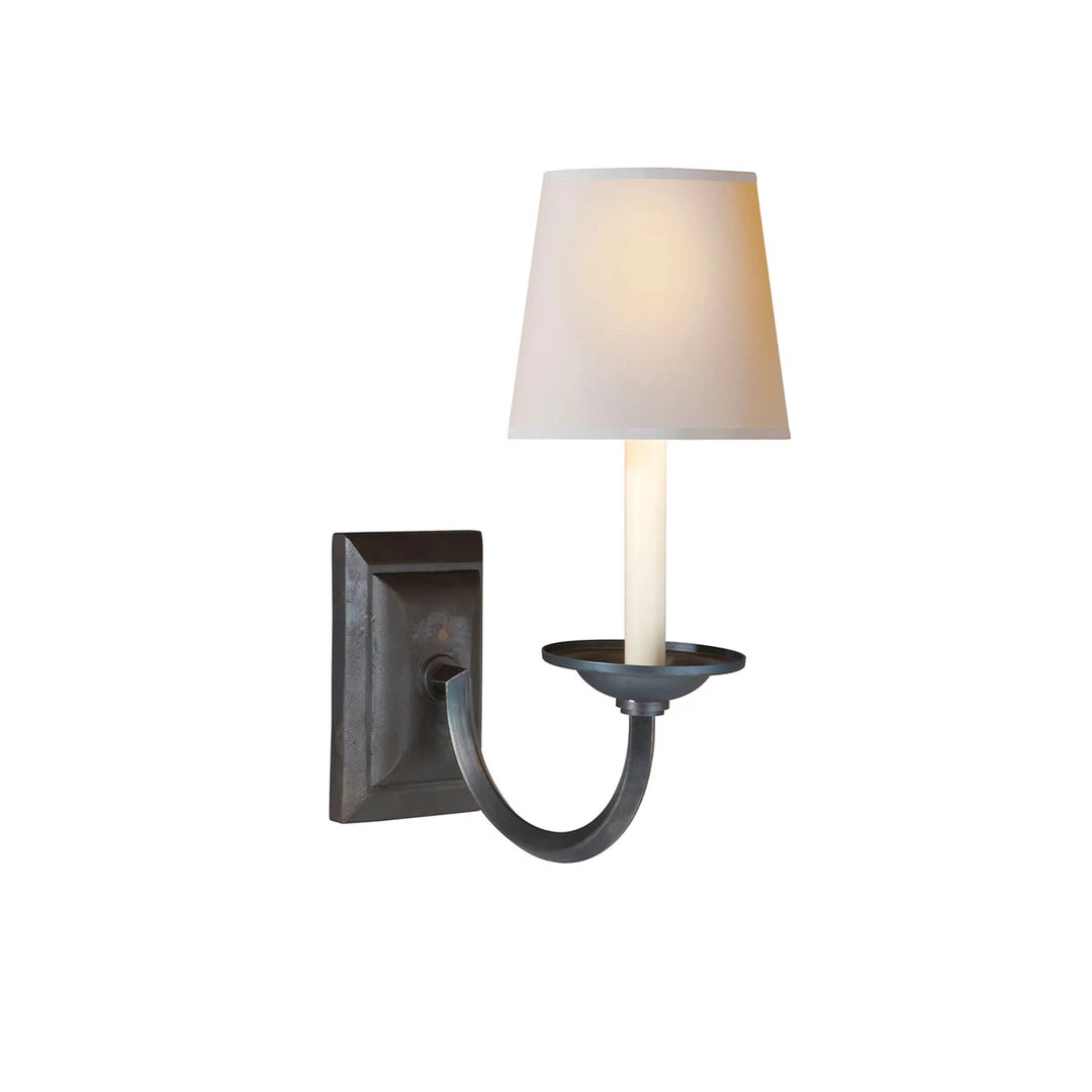 The Flemish Single Sconce is a minimalist approach to a traditional wall sconce. With a natural linen paper shade to compliment the aged iron, this is a soft and effortless addition to your bathroom, mantle, or entrance.