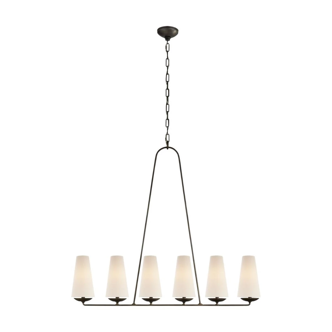 The Fontaine Linear Chandelier is traditional in design, with a modern twist. The linen shades are hung by a curved aged iron bar, and hangs in a linear form that is perfect above any dining table or statement piece.