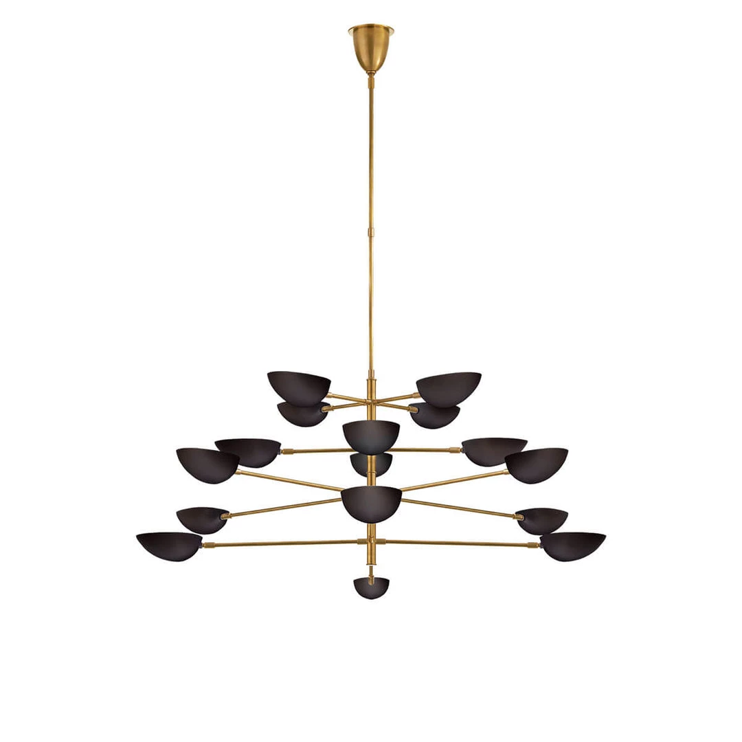 The Graphic Grande Multi-Tier Chandelier includes sixteen shades in either white glass or black glass. The modern, tiered body is softened by the rounded shades making it the perfect transitional piece for your tall foyer, staircase or high ceiling room.