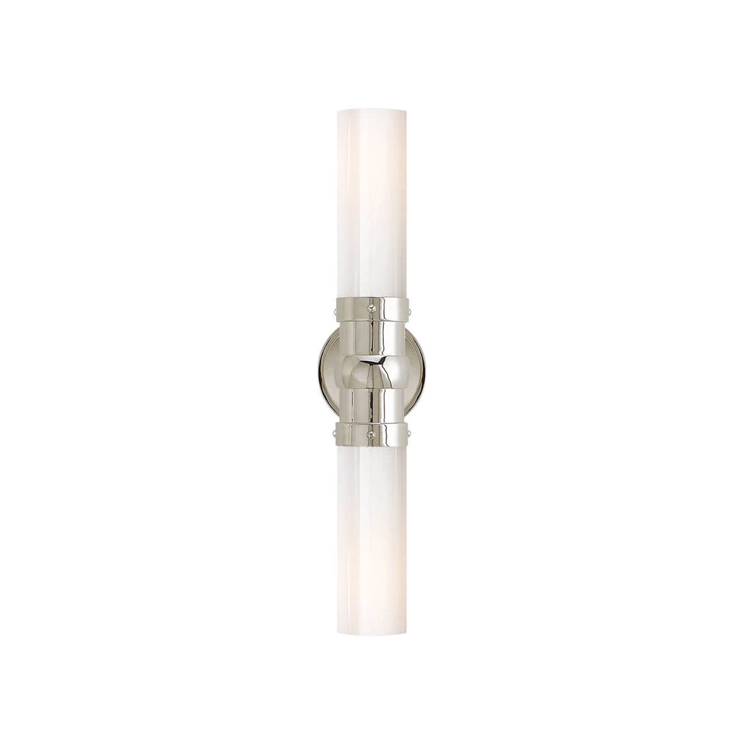 The Graydon Double Wall Sconce has an industrial look. The middle backplate resembling a piping t-joint holds a white glass shade below and above. This sconce can be mounted vertically or horizontally.