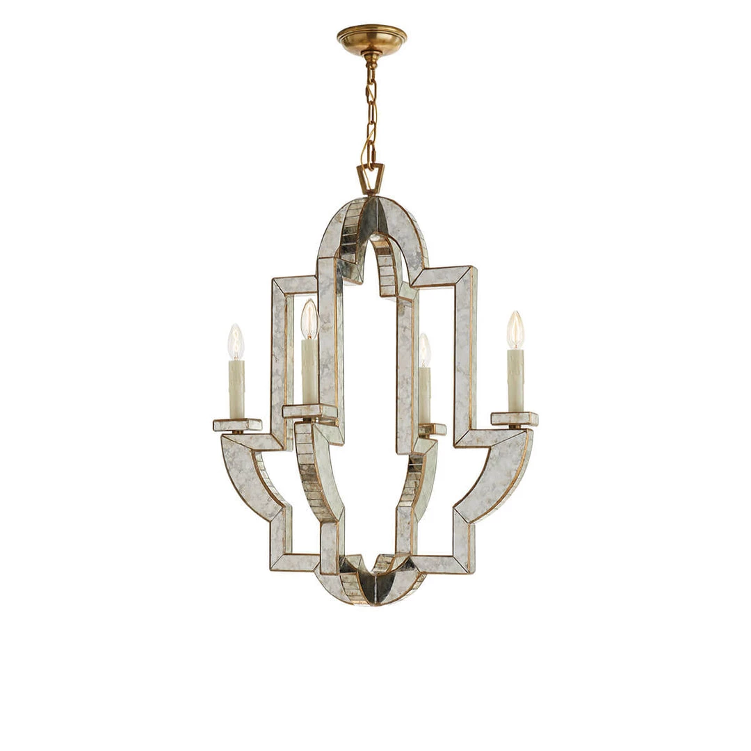 The elegant Lido medium Chandelier adds dimension to your ceiling lighting with its antique mirrored finish and four candle lights set on a hand-rubbed antique brass frame.