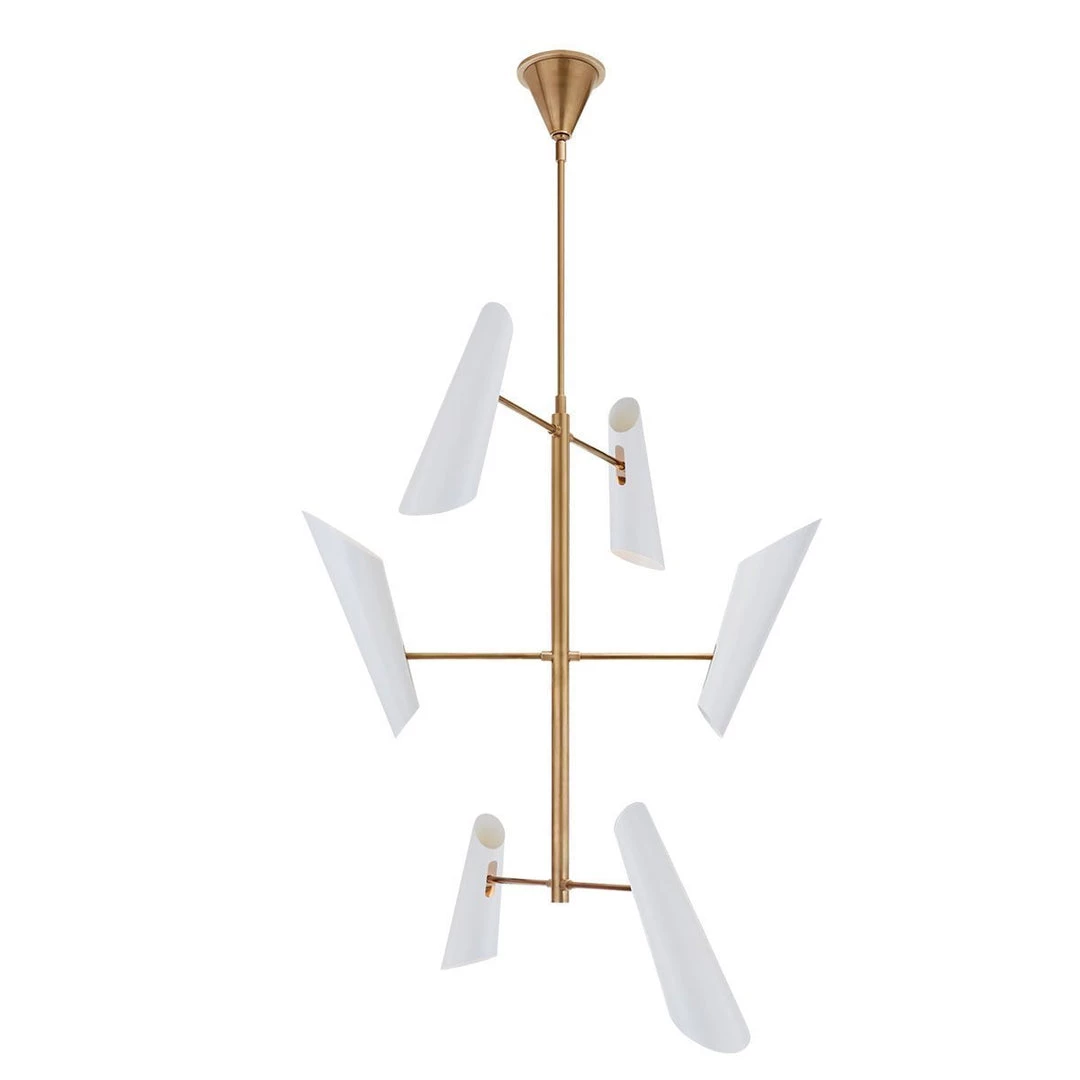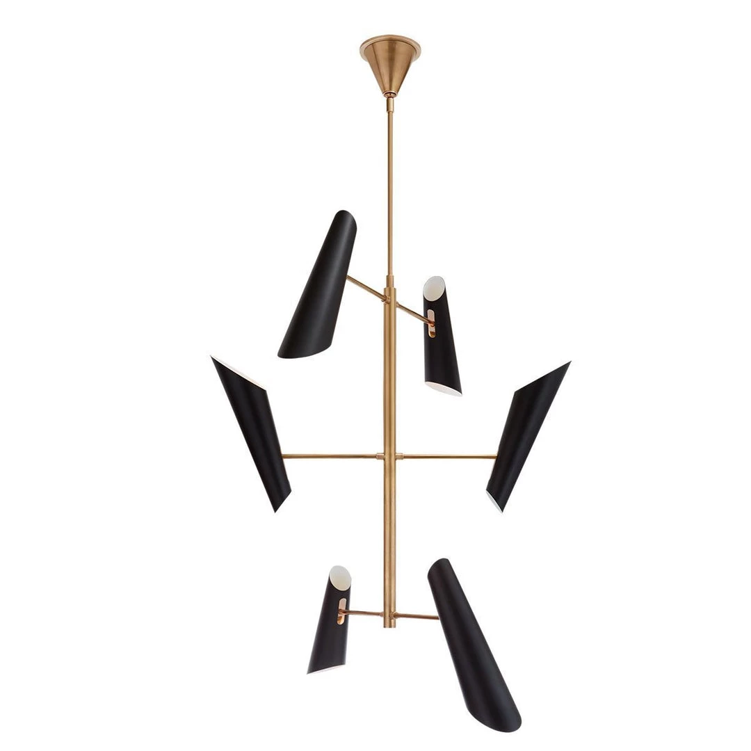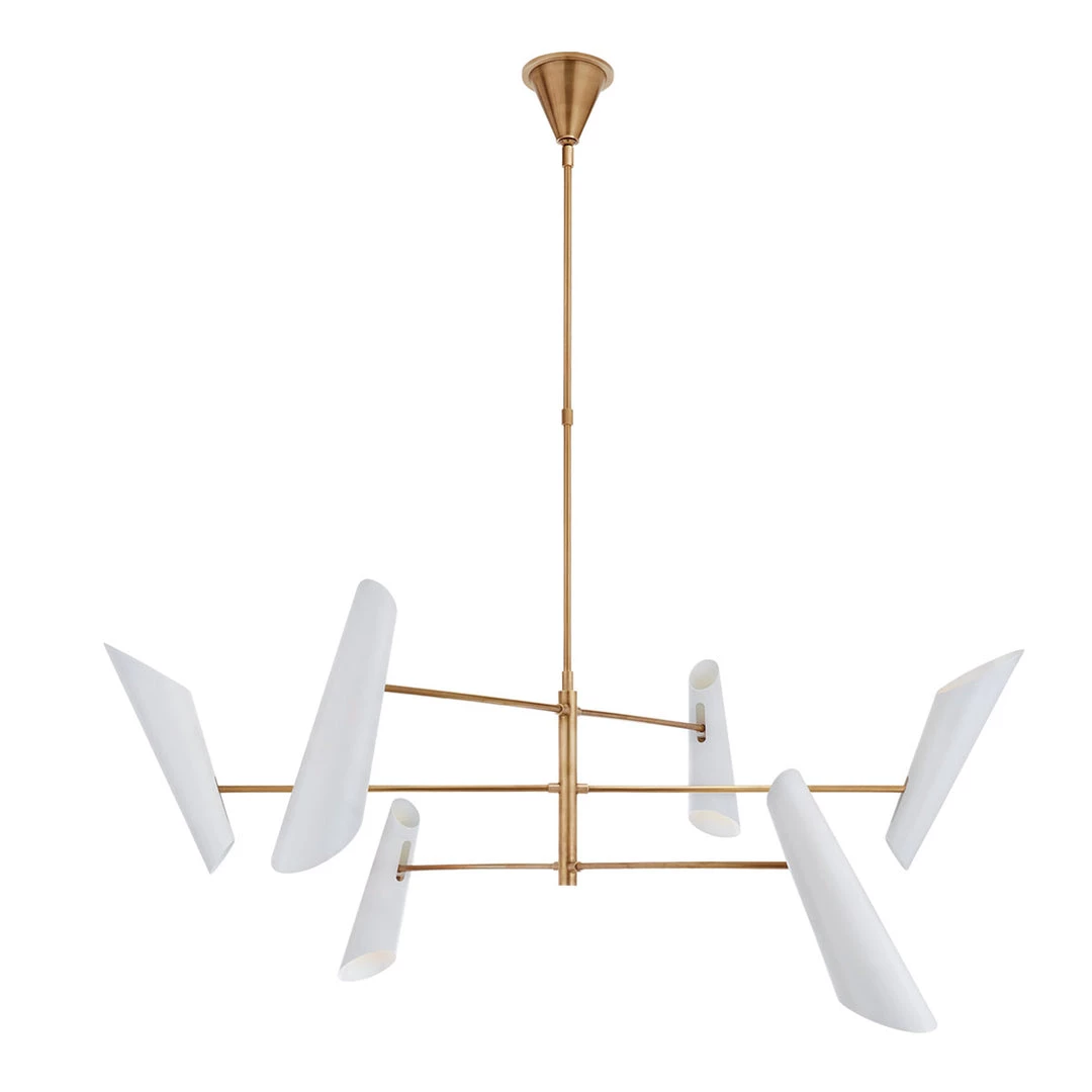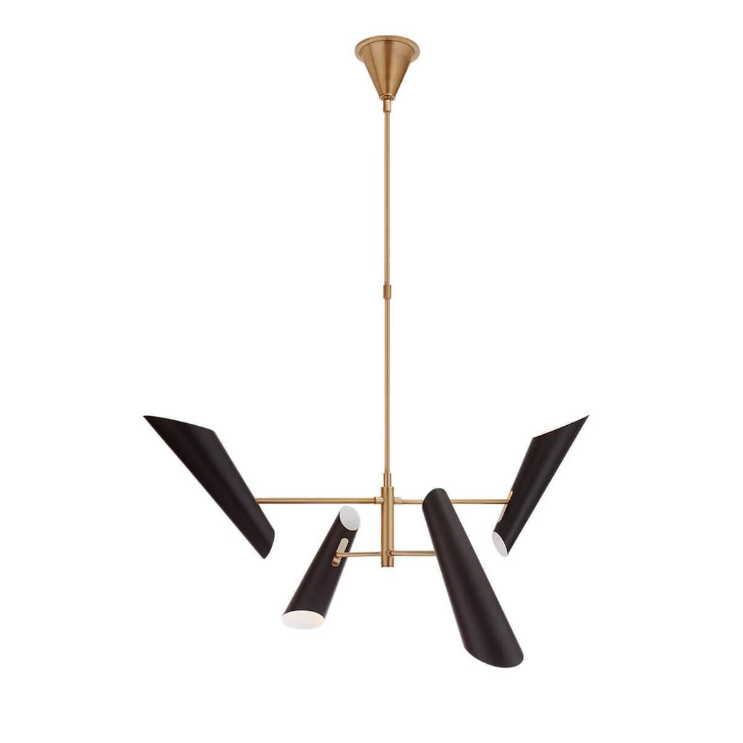 The Franca Pivoting Chandelier is a Mid-Century Modern beauty! This chandelier is composed of multiple pivoting shades on slim tiered rods. The shades are available in black or white, paired with an antique brass body.