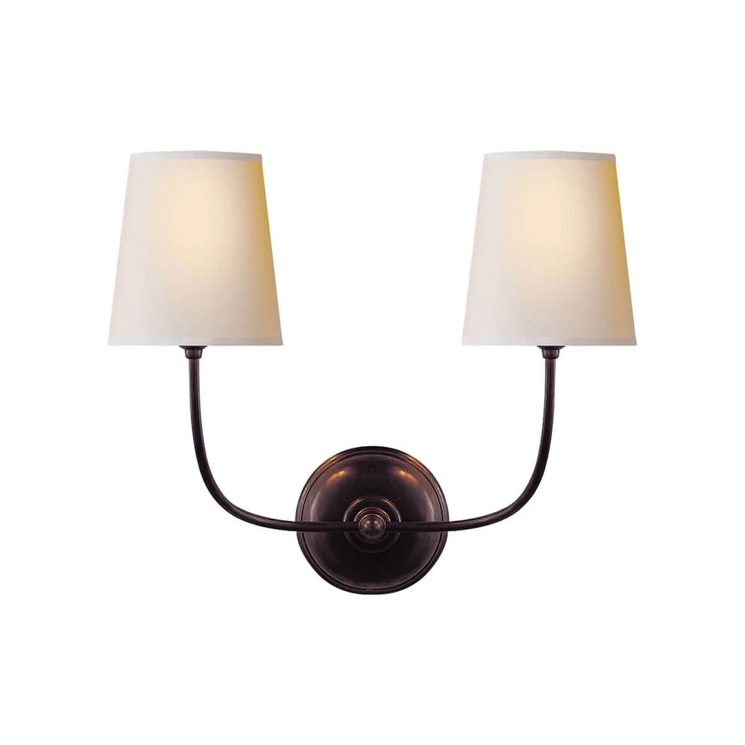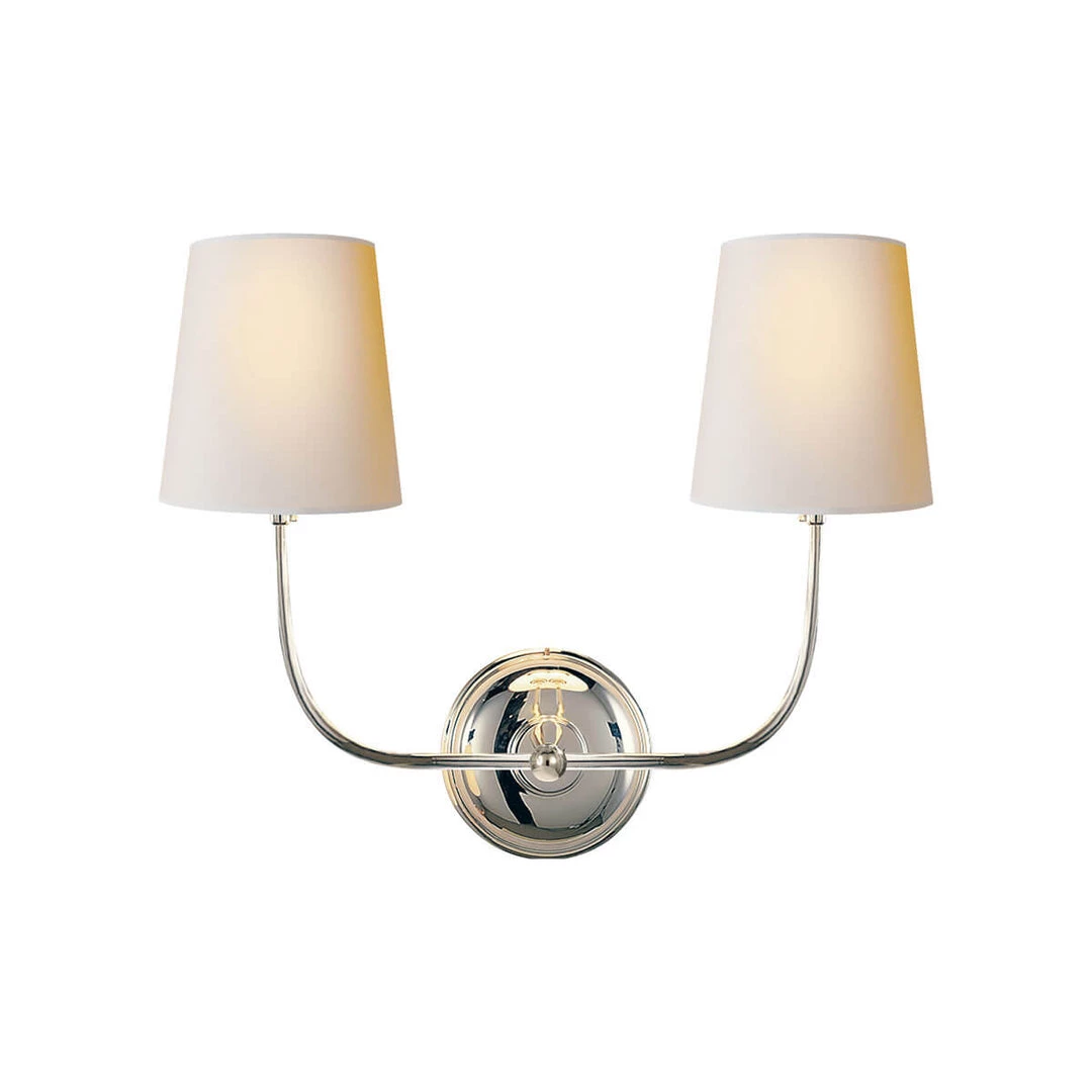 The Vendome Double Wall Sconce features two slim arms with natural paper shades from a single circular backplate. Available in a variety of finishes.