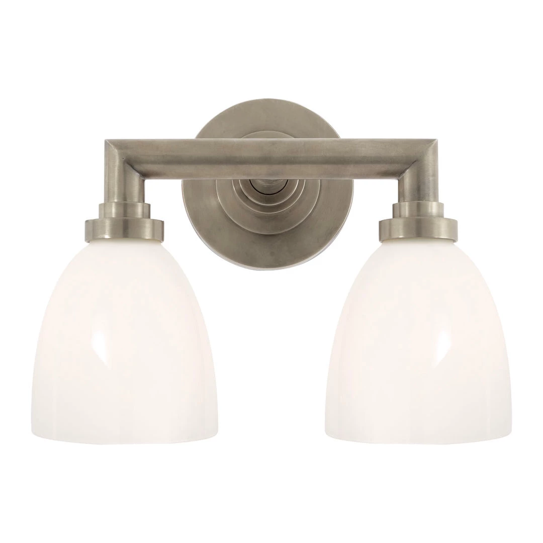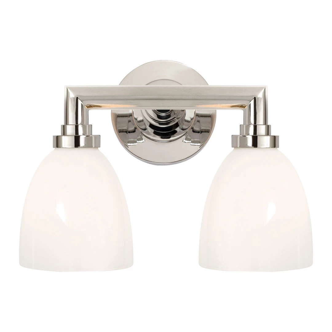 The Wilton Double Sconce brings a thoughtful design element to your bathroom with its traditional curved white glass shade and double extension industrial silhouette.