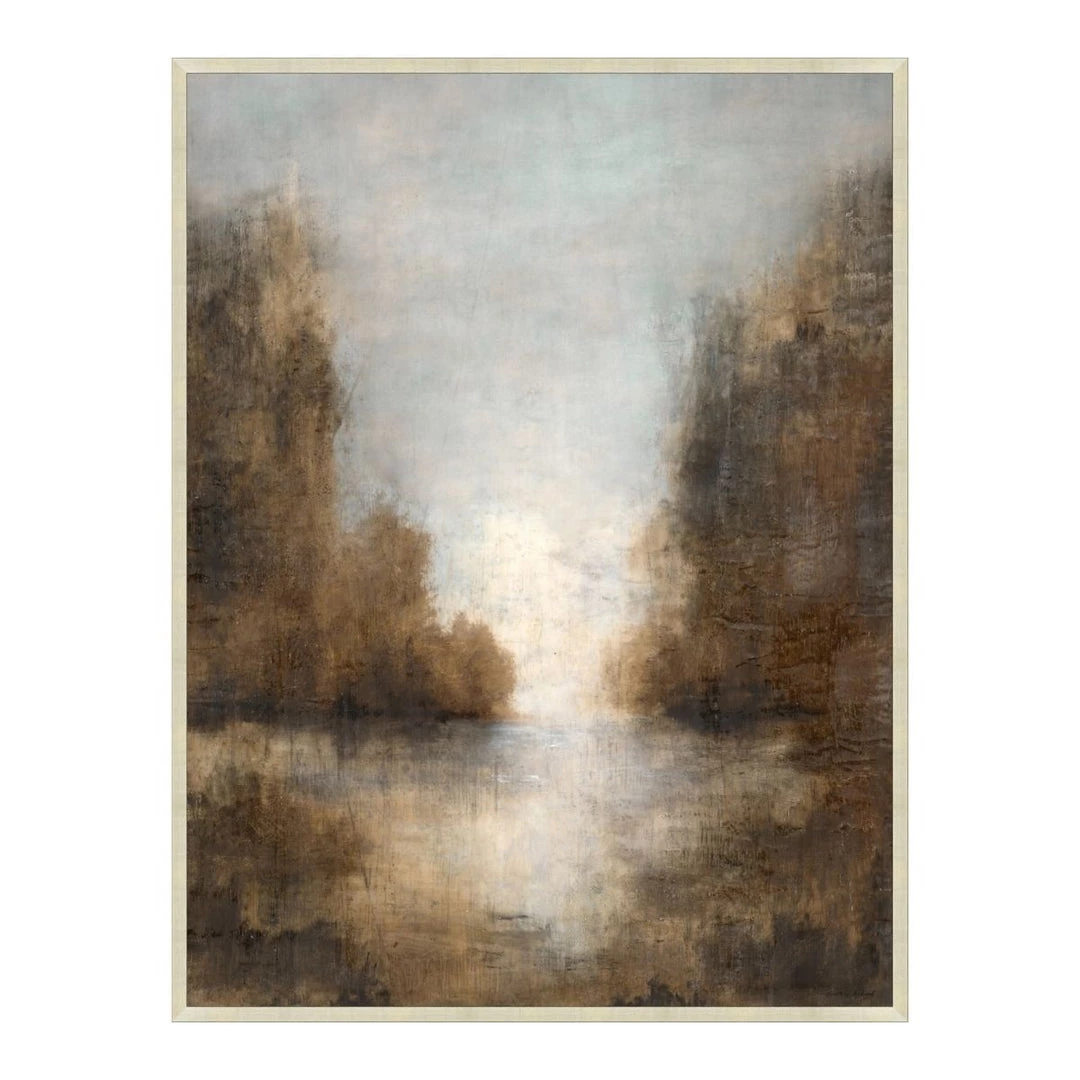 Bold with contrasting blue and brown tones, this canvas boasts a serene river bed surrounded by a large forest motif. The pair of warm and blue tones allows for a neutral piece that is perfect for any home, traditional or modern.Â