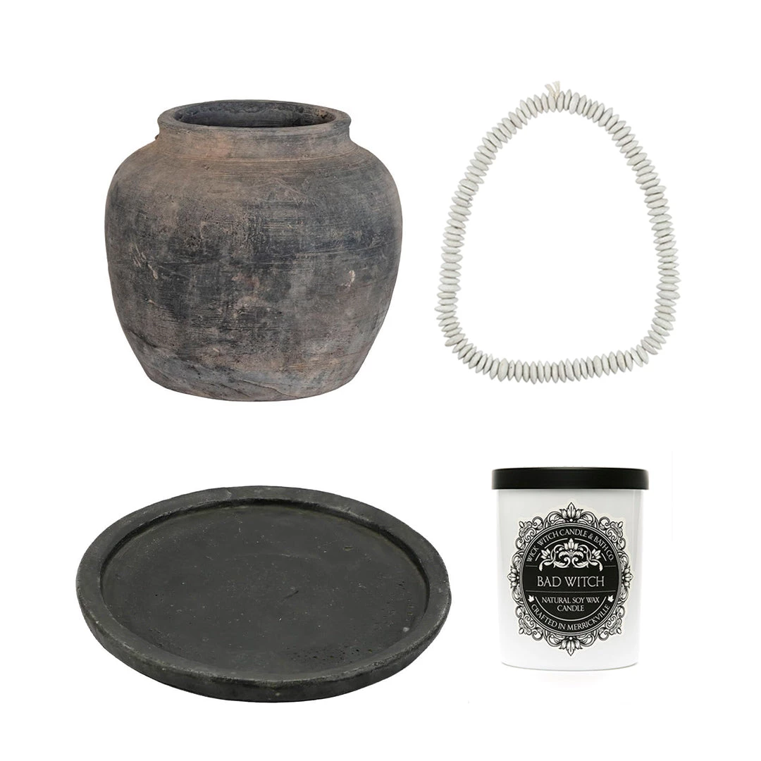 Create a calming environment with this beautiful ensemble of the small Madera Pot, a Bad Witch Scented Soy Candle, a string of Ashanti Beads, and a vintage Mumbai Plate