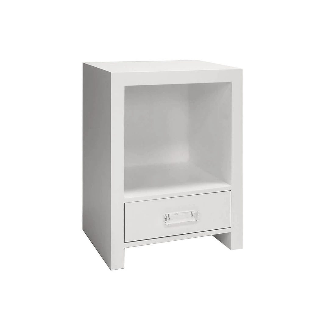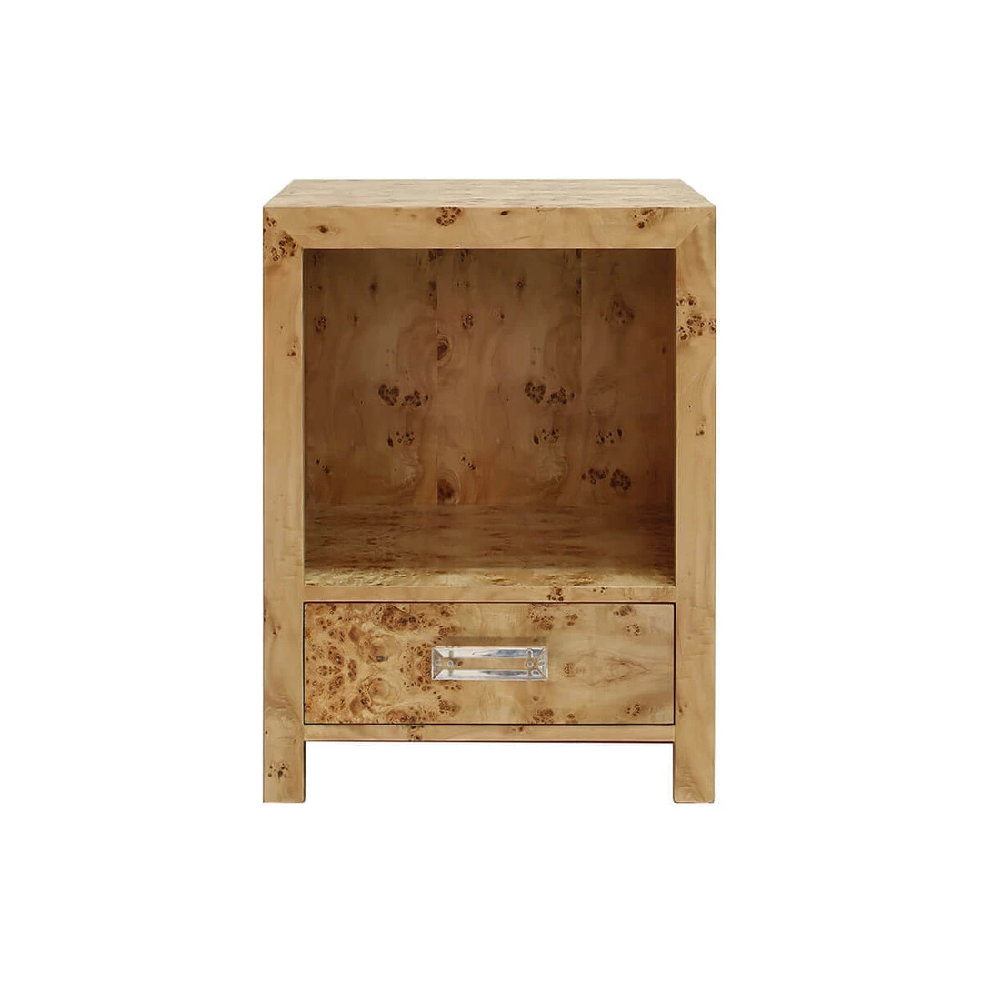 The Clearwater Nightstand has one drawer at the base of the side table complimented with acrylic hardware. The bedroom furniture piece is finished in matte white lacquer or in a natural burl wood