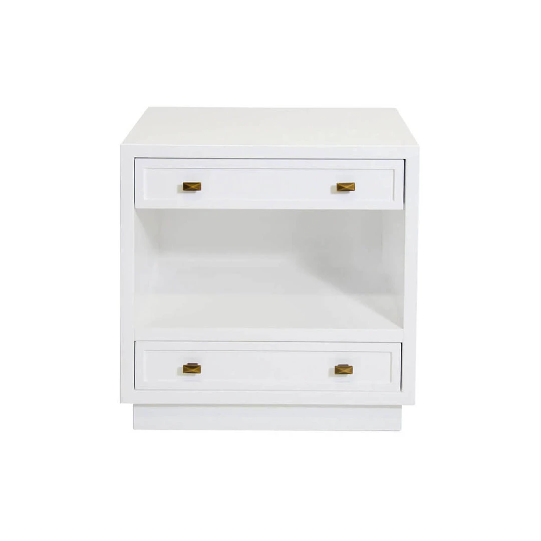 The Northampton Nightstand is charming and simple beside your bed. The white lacquer nightstand features two drawers on the top and bottom of an open shelf. Antiqued hardware adds another design element.