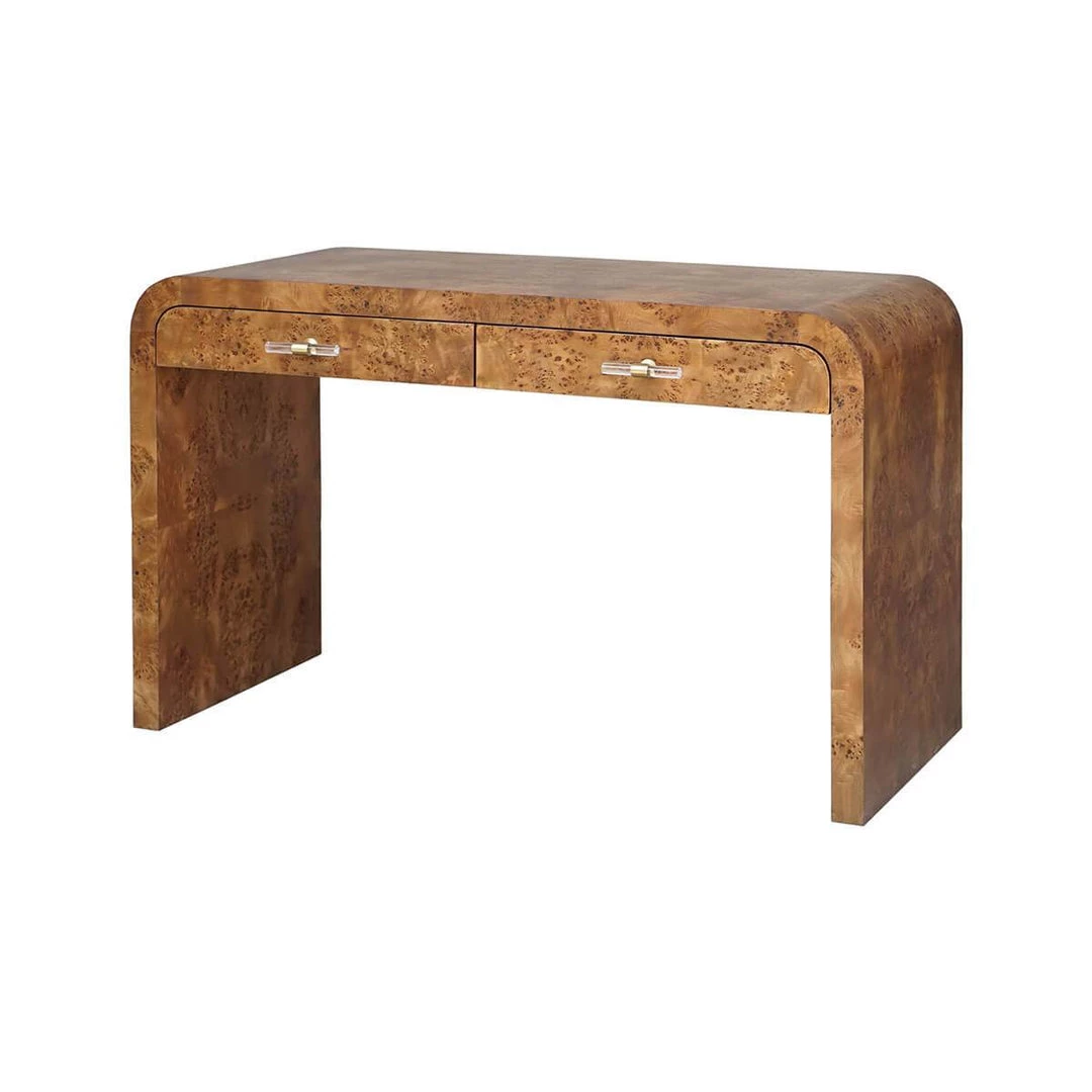 The Halki Desk brings a hint of the Art Deco styling to your home office. The Waterfall edge desk in a matte dark burl wood is beautiful in texture and in shape.