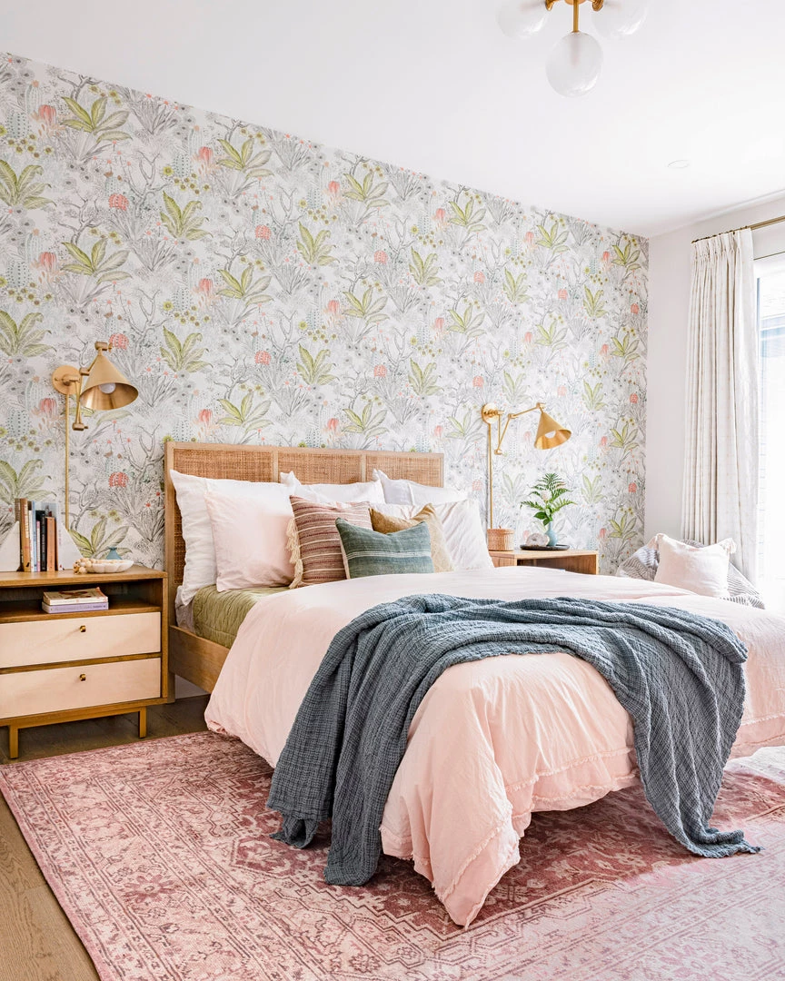 The Floral Desert Wallpaper brings a youthful essence to your decor with delightful flowers and desert imagery. Full of subtle hues of green, blue, tan, grey, and pink, this wallpaper acts as a beautiful mural. Add this to a child’s room or nursery for a playful design element.